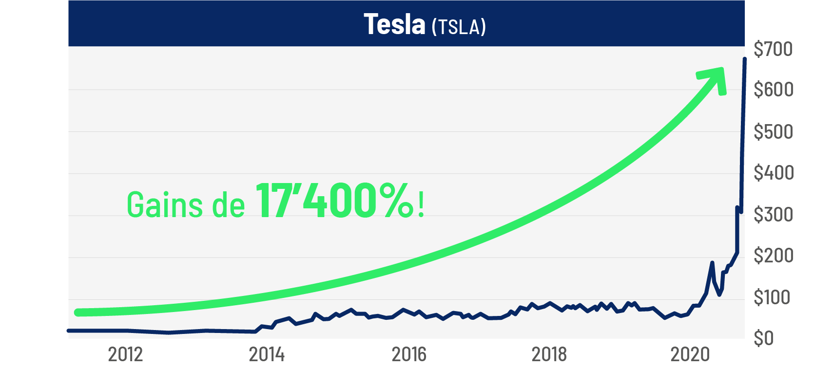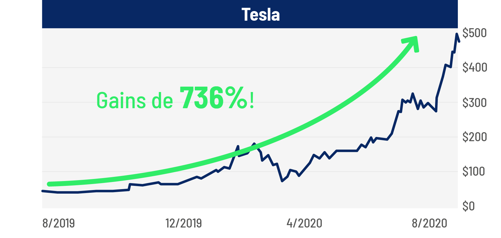 Mais notre expert Ian King a compris le potentiel de l’entreprise : en août 2019, il a recommandé Tesla à tous ses lecteurs. Autant vous dire que, si vous l’aviez suivi à l’époque, vous auriez engrangé une belle plus-value :